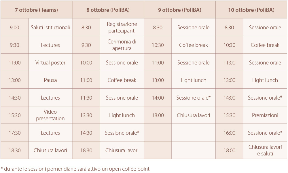 Dall’8 al 10 ottobre sono programmate le sessioni orali in presenza, durante le quali si susseguiranno le relazioni orali dei congressisti, presso la Sala Domus Sapientiae del Dipartimento di Architettura, Costruzione e Design del Politecnico di Bari.