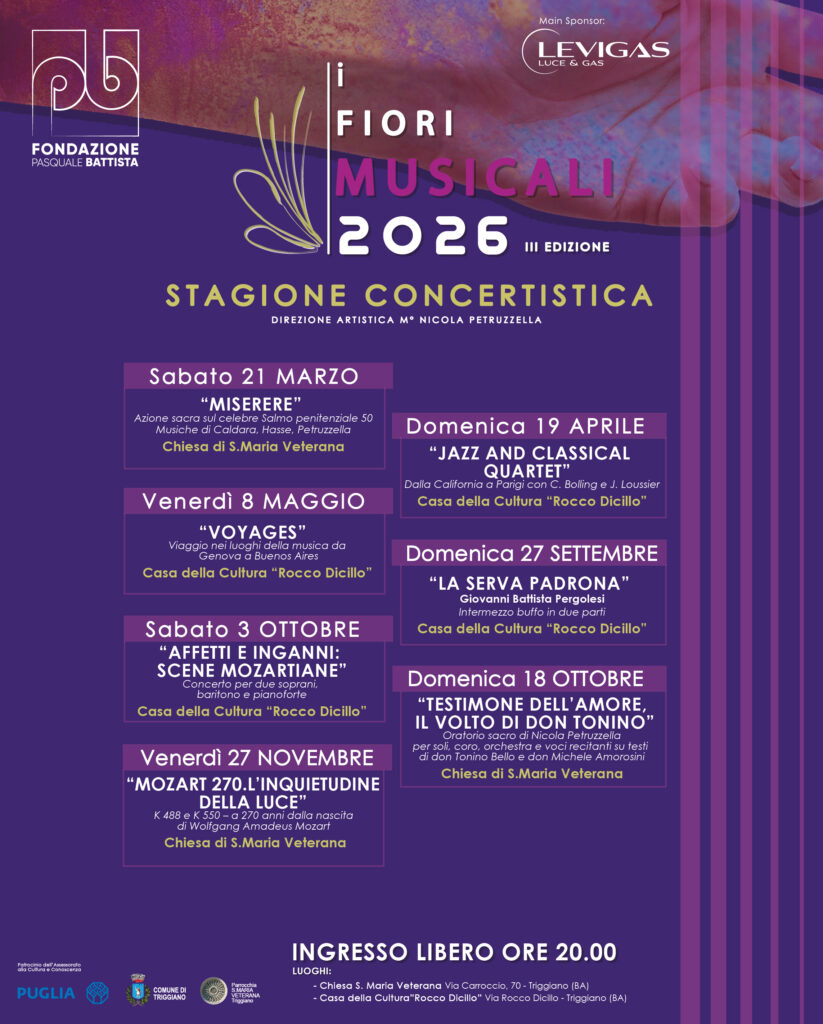 La stagione musicale “I Fiori Musicali” – III Edizione prende il via sotto il segno della ricerca e della varietà sonora, con il sostegno della Fondazione Pasquale Battista, che ha riposto fiducia nel progetto. Questo percorso celebra la musica in tutte le sue forme: dall’intimità del Miserere barocco, alla libertà creativa dei quartetti jazz-classici, dai viaggi sonori da Genova a Buenos Aires, fino alla leggerezza buffa de La serva padrona di Giovanni Battista Pergolesi e alle tensioni emotive di Mozart.